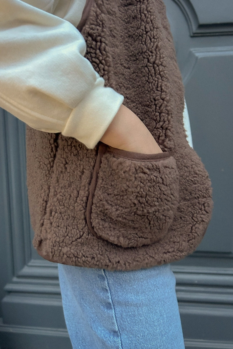 Pour cette pièce en fausse fourrure, nous avons fait le choix du polyester, une matière incontournable pour obtenir cet aspect duveteux, chaud et durable, sans recourir à des fibres d’origine animale.